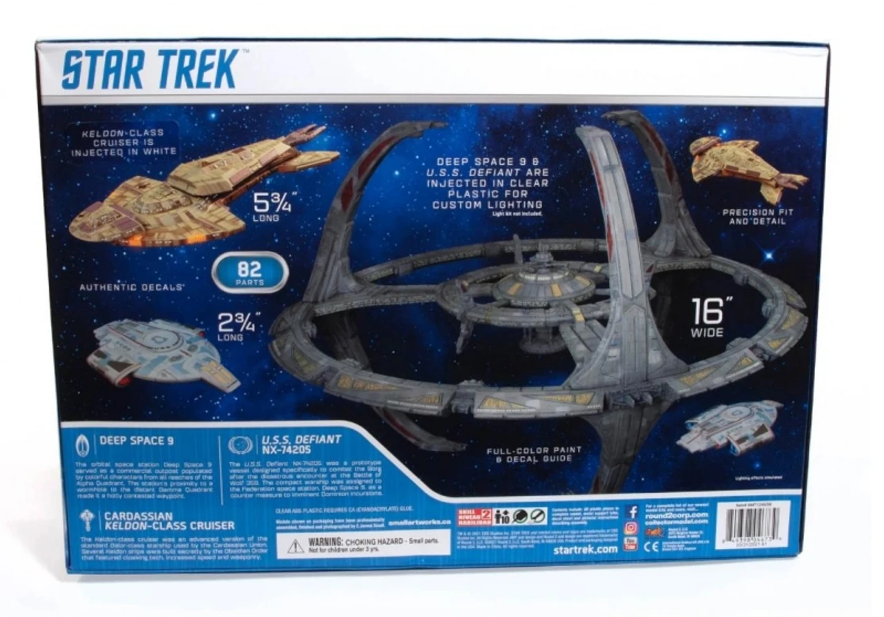 The 16″ wide STAR TREK: Deep Space Nine plastic assembly kit features the titular Deep Space 9 station along with 2 ships, the USS Defiant NX-74205 and a Cardassian Keldon-Class cruiser.