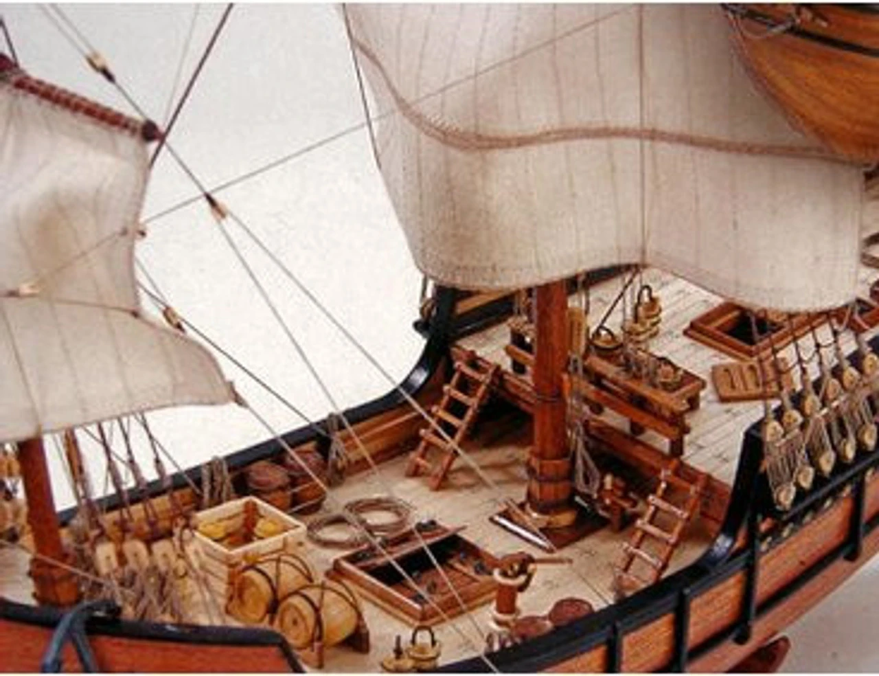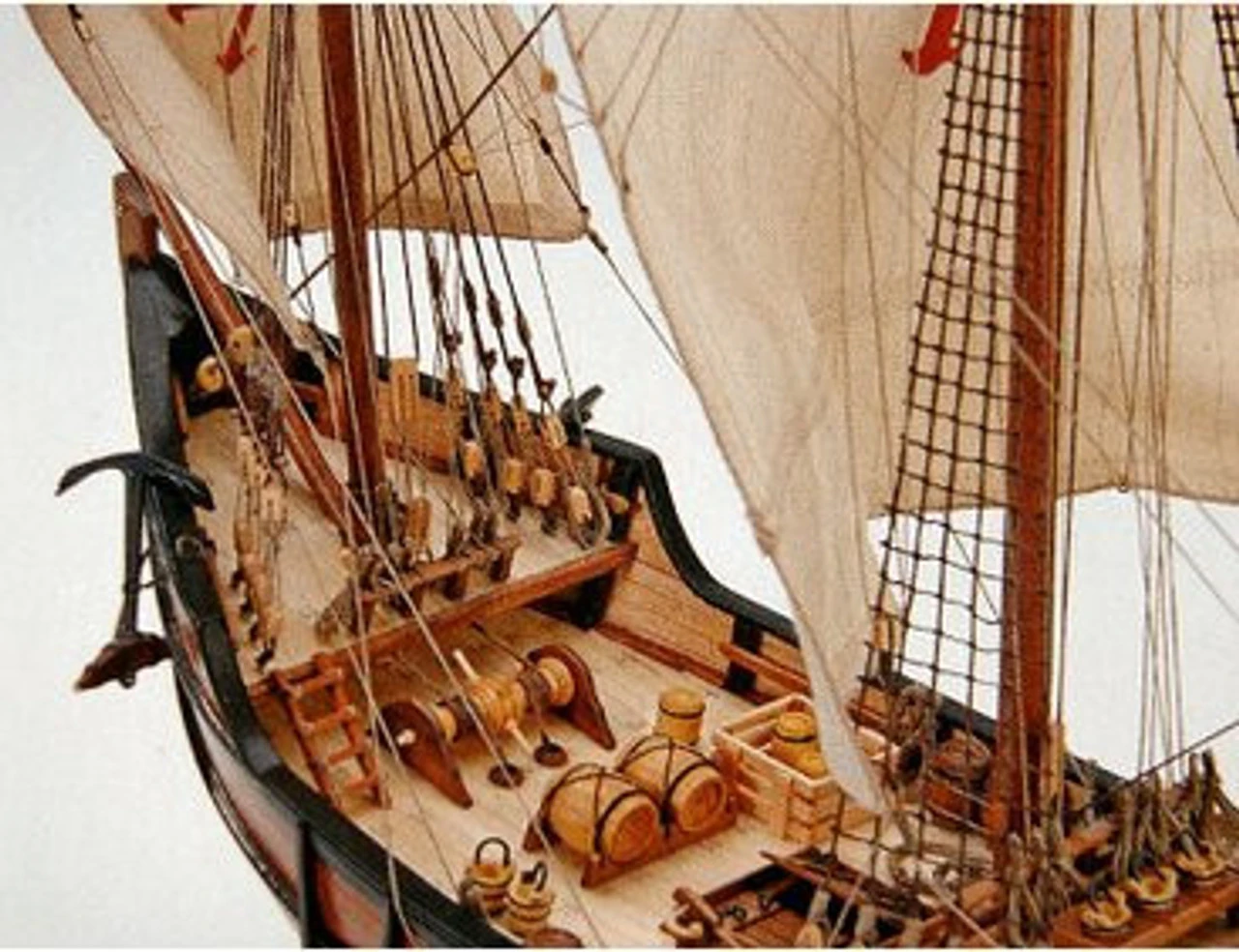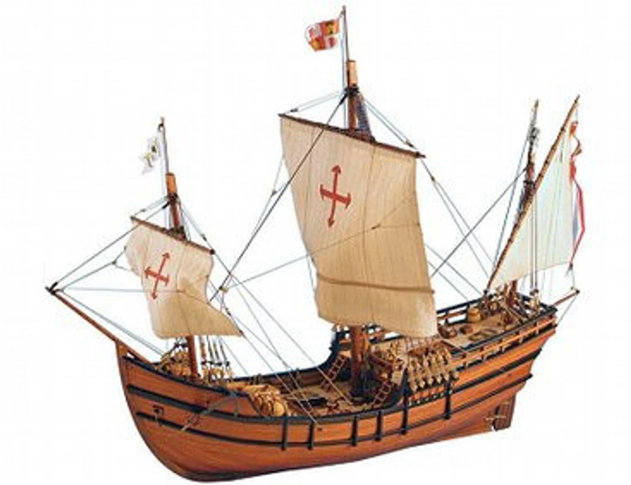 This Artesania Latina wooden boat model is highly realistic with many fine details. This model features all-wood, double plank-on-bulkhead construction using woods including african walnut, mukali, plywood, and sapelli. Detailing parts in brass include eyebolts, hinges, capstan, nails and more. Two colours of brown thread, for rigging applications, add to the detail, while pre-prepared hand sewn and sized cloth sails aid the completion of the model.