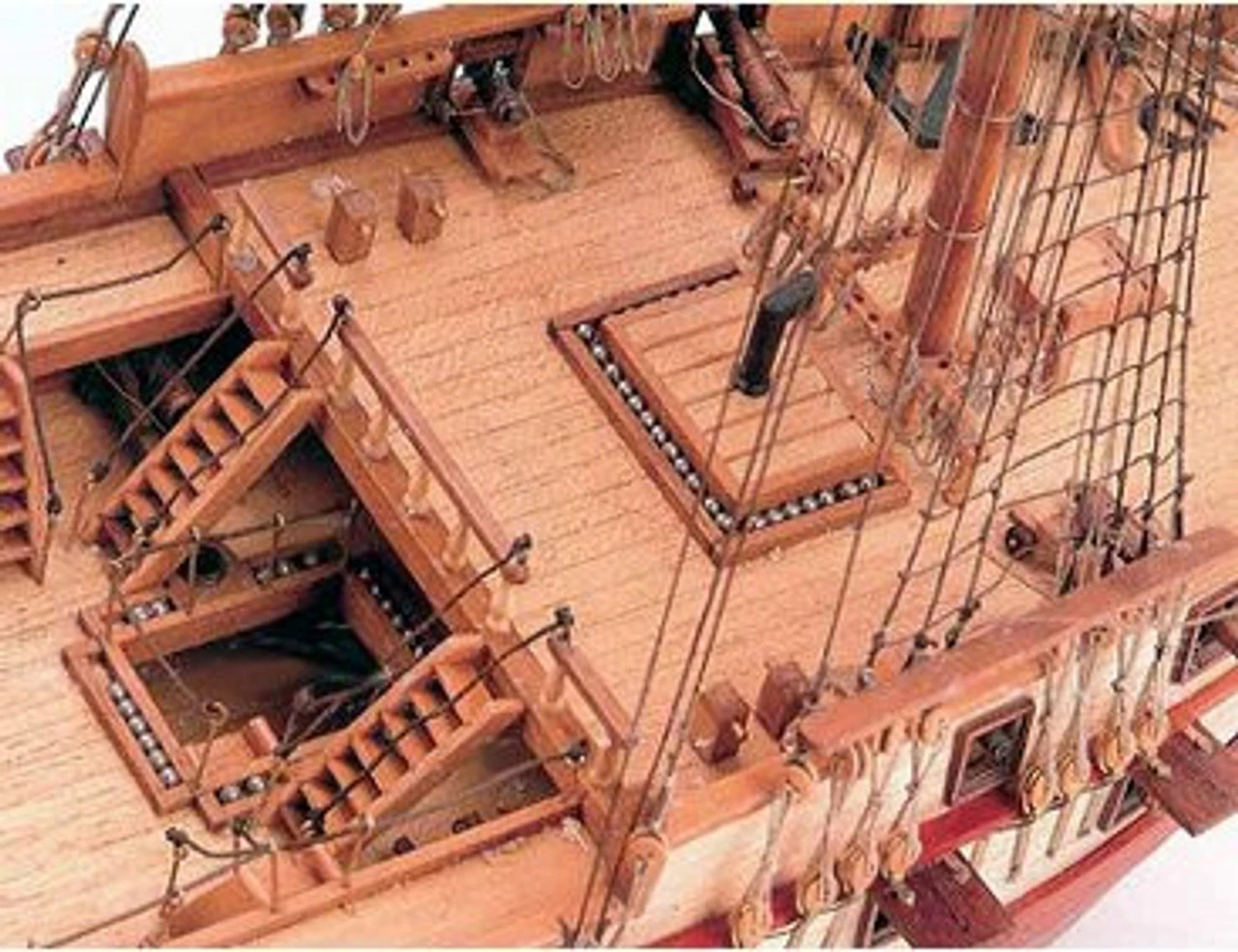 Artesania Latina’s USS Constellation kit features double plank-on-bulkhead construction and an abundance of brass hardware such as eyebolts, stanchions, rings, hinges and more. A highly detailed brass bow figurehead and stern parts are also inlcuded. The kit includes all hull planking strakes, masts, bowsprit, 10 spools of rigging thread and all other necessary details. Pre-sewn sails ready for rigging are also included along with excellent plans and detailed instructions.