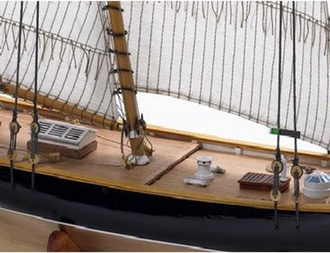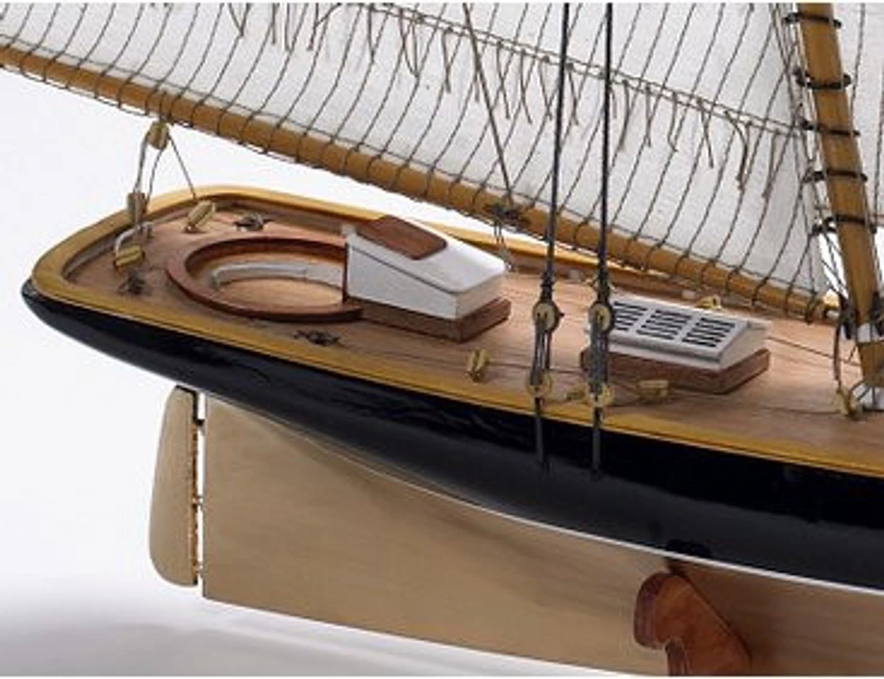 This kit features plank on frame construction, laser cut plywood keel and frame components, wooden superstructure and decks, hull and deck fittings in wood, brass and/or plastic, mast and spars and rigging cord in various sizes and printed sails. It includes full-size plan sheets and an instruction manual with English text. Â