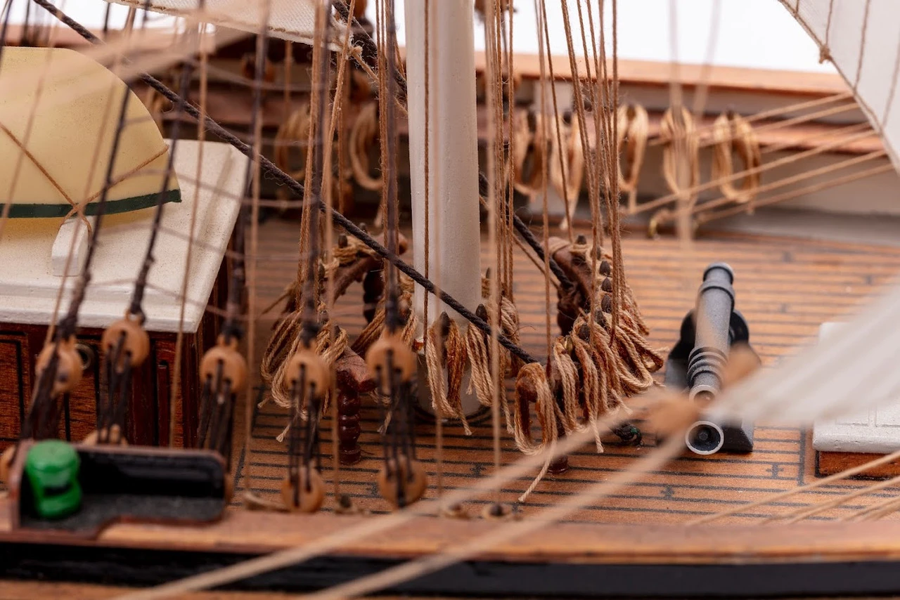 This kit features plank on frame construction, laser cut plywood keel and frame components, wooden superstructure and decks, hull and deck fittings in wood, brass and/or plastic, mast and spars, rigging cord in various sizes and printed sails. It also includes full-size plan sheets and an instruction manual with English text. This wooden boat kit is recommended for the expert modeller.