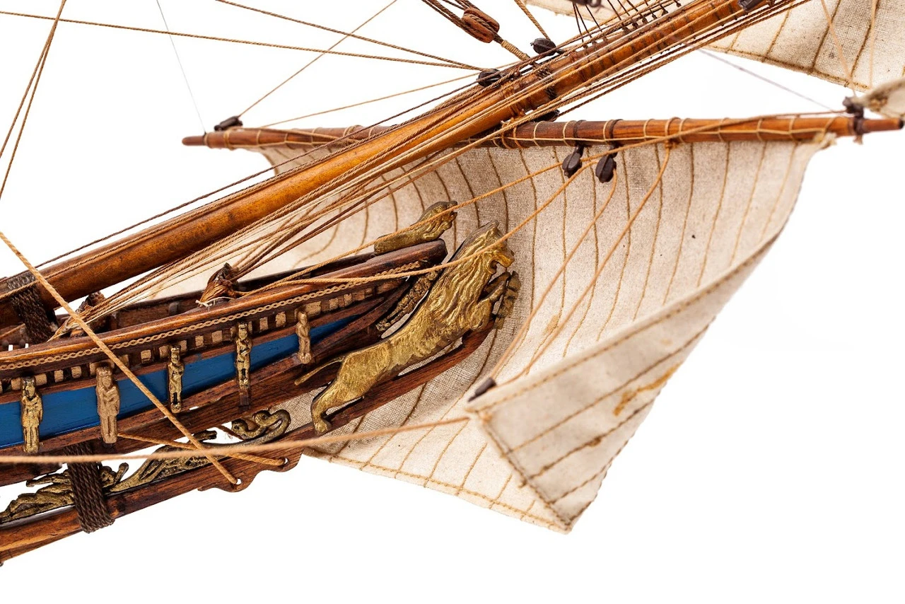 This kit features plank on frame construction, laser cut plywood keel and frame components, wooden superstructure and decks, hull and deck fittings in wood, brass and plastic, mast and spars, rigging cord in various sizes and printed sails. It includes full-size plan sheets and an instruction manual with English text.