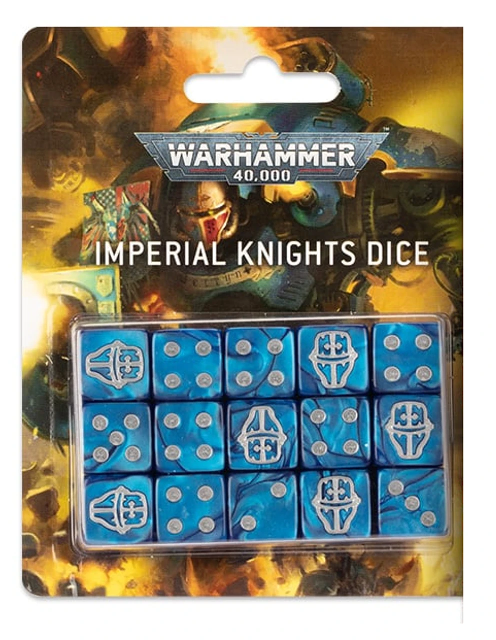 The Imperial Knights Dice Set provides a set of 15 six-sided themed dice measuring 16mm along each edge. They are cast in pearlescent colours, with faction icons on each 6 face.Â