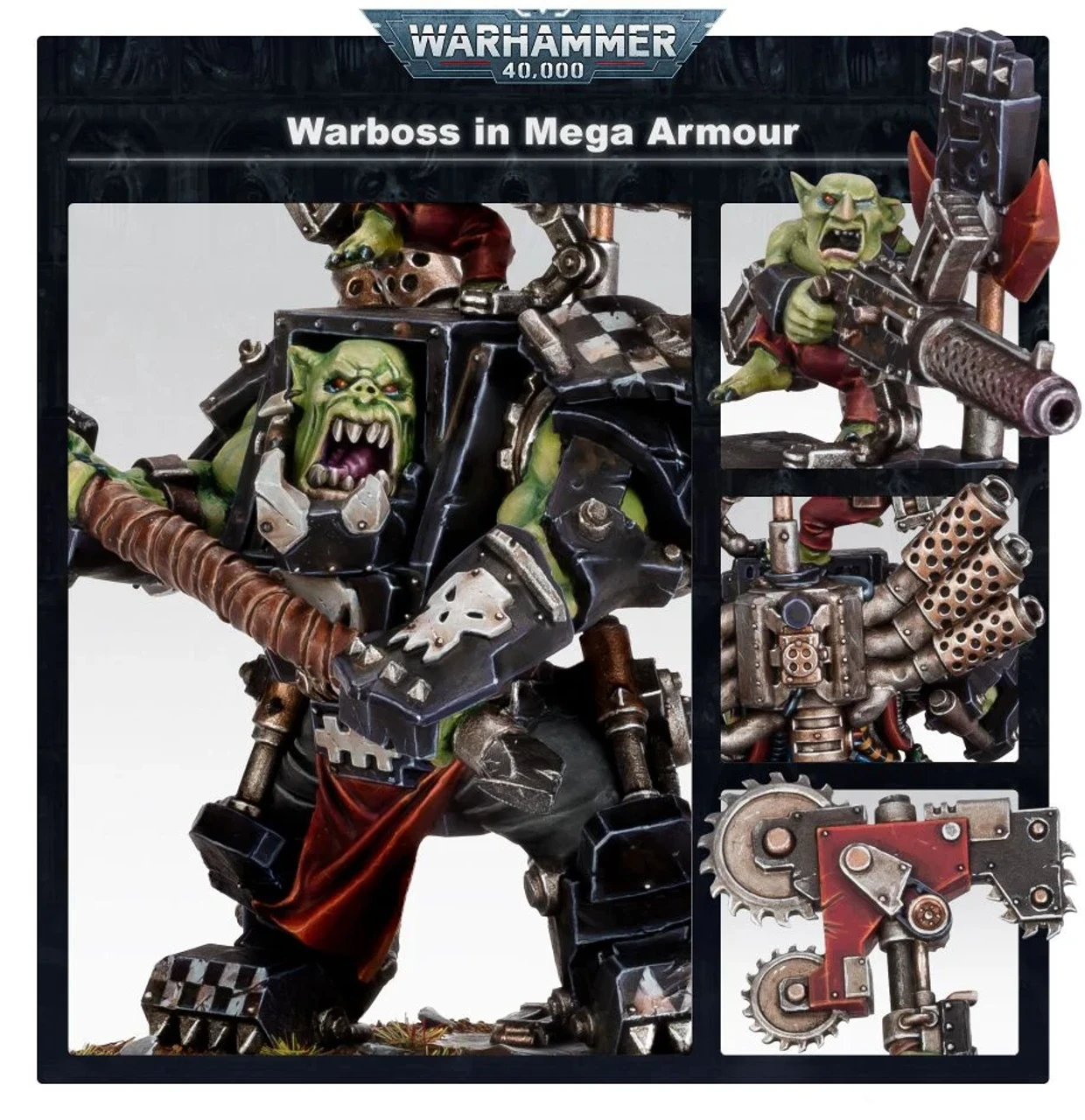 Any good Ork Hunter knows the safest way to deal with a rampaging Warboss is to hit them with tank-busting artillery from as far away as possible. By donning a piston-driven suit of incredibly durable mega armour, this Warboss makes a mockery of such underhanded enemy tactics, much to the terror of his foes.