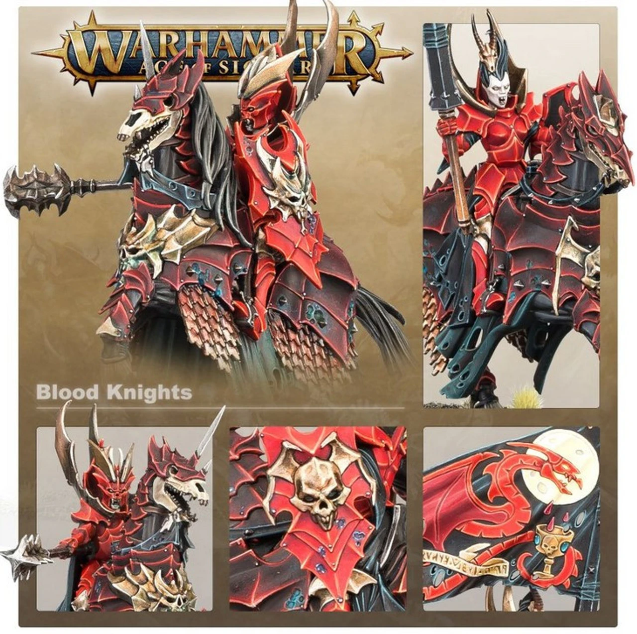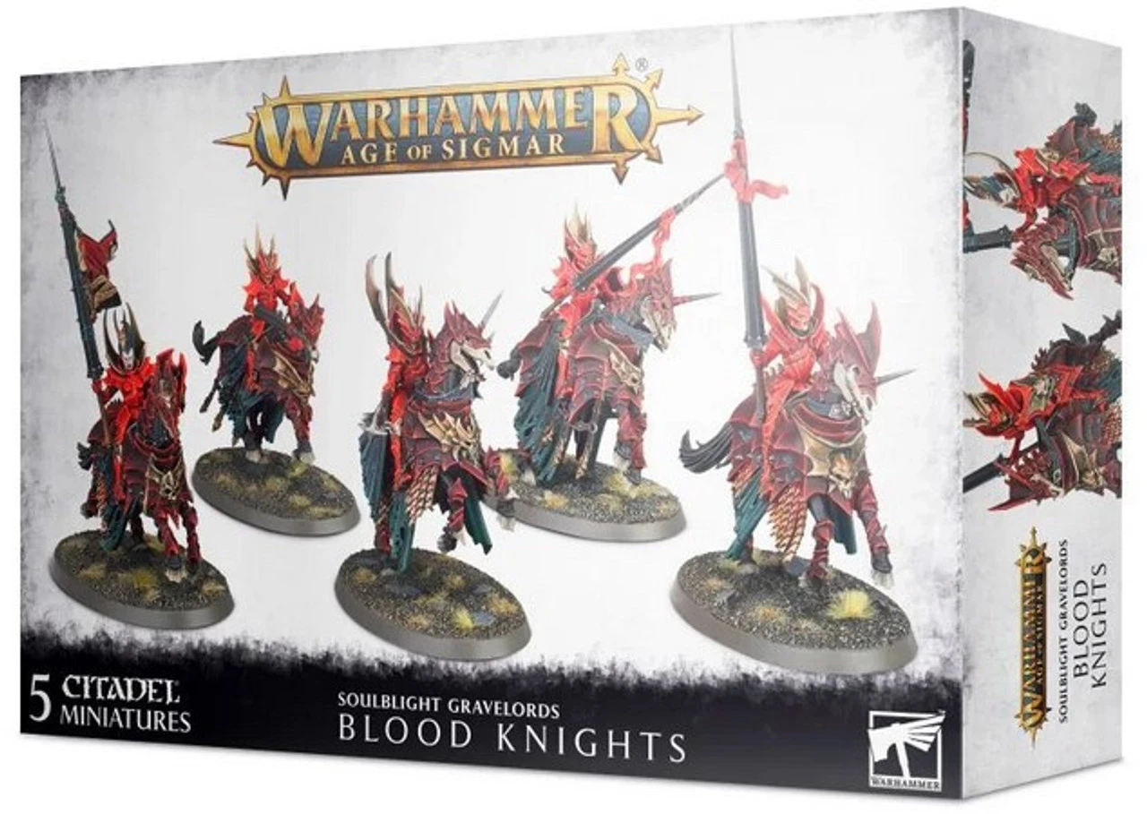 The Soulblight Gravelords Blood Knights from the Warhammer Age of Sigmar range. Some vampires dedicate their eternal lives to the mastery of one pursuit, and those determined to become peerless warriors invariably end up among the ranks of the Blood Knights. Atop their hulking undead nightmare mounts and clad in thick plate armour, these martial experts are unstoppable on the charge and take a supreme satisfaction in trampling lesser mortal soldiers beneath them.