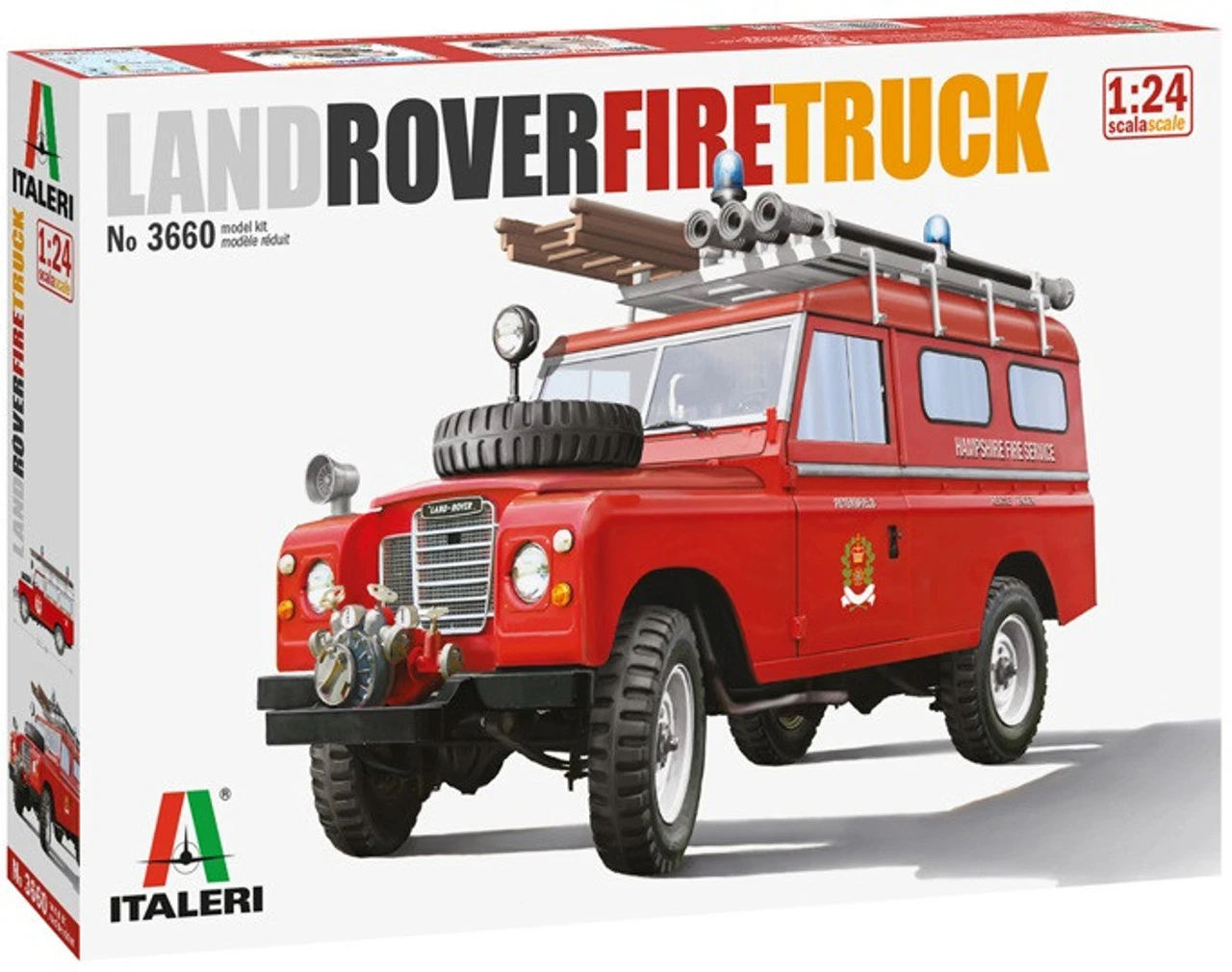 The Italeri 1/24 Land Rover Fire Truck plastic car model accurately recreates the real life off-road Emergency vehicle. This plastic car kit requires paint and glue to complete.