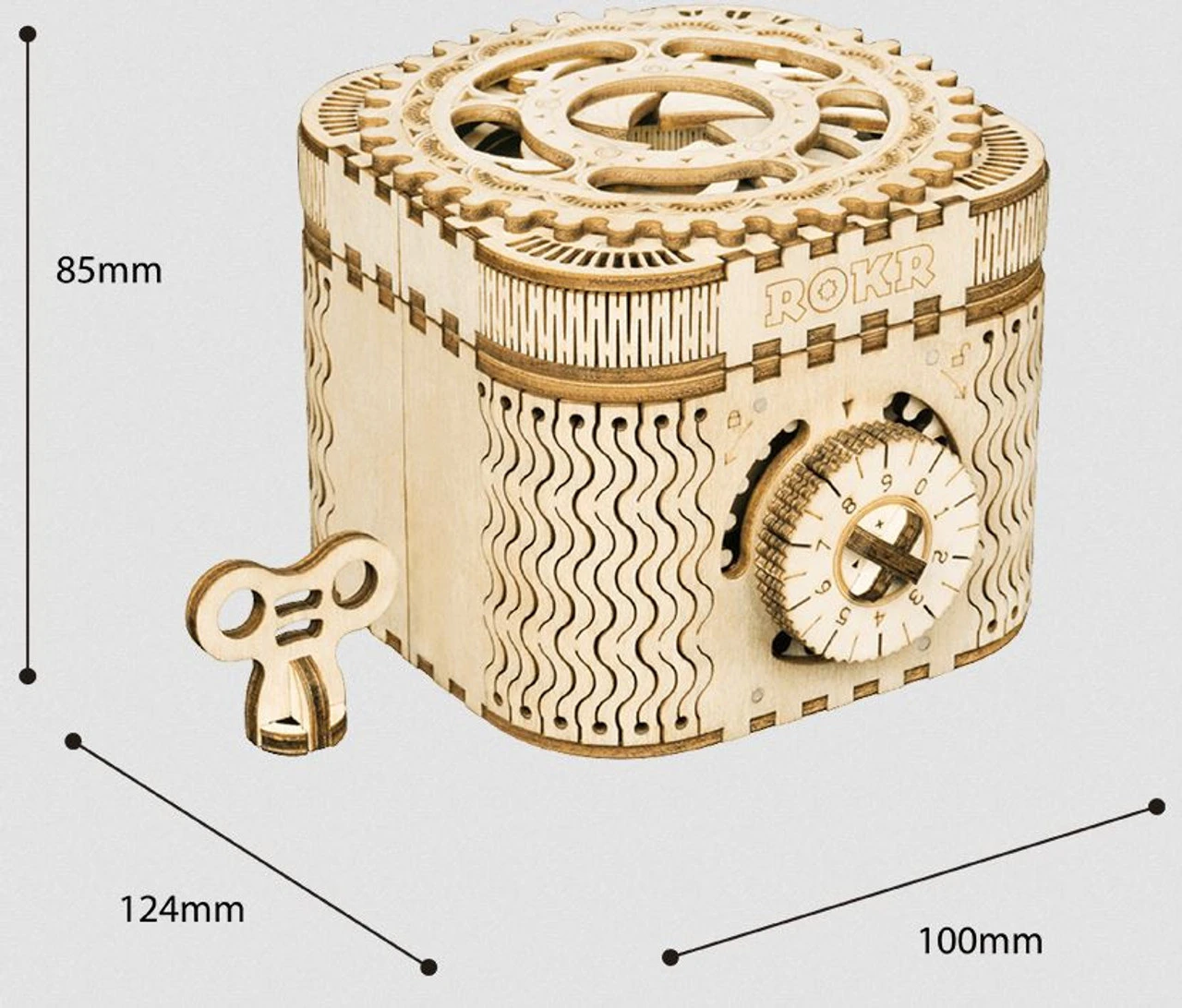 The Rokr Treasure Box 3D Wooden Kit from the wooden models range measures 100 x 124 x 85mm.