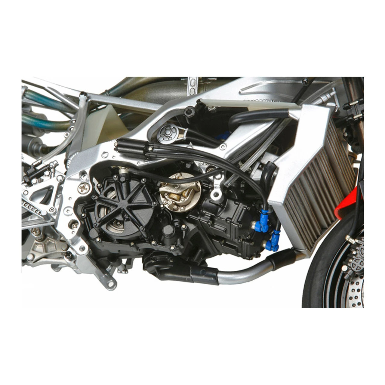 During the 1983 World Grand Prix season, Honda took the championship with the NS500 but it was clear that the power from the 2-stroke V3 engine would be insufficient for the next season. This led Honda to create the NSR500, which was powered by a more powerful V4 engine. It also featured a unique aluminum frame to house the engine and a radical layout in which the expansion chambers and the fuel tank were positioned above and below the engine respectively. The 1984 season was challenging but the following season saw the NSR500 demonstrate its excellent performance to win the championship. The Tamiya 1/12 model kit faithfully brings all the details of this famous GP bike to hobbyists around the world.