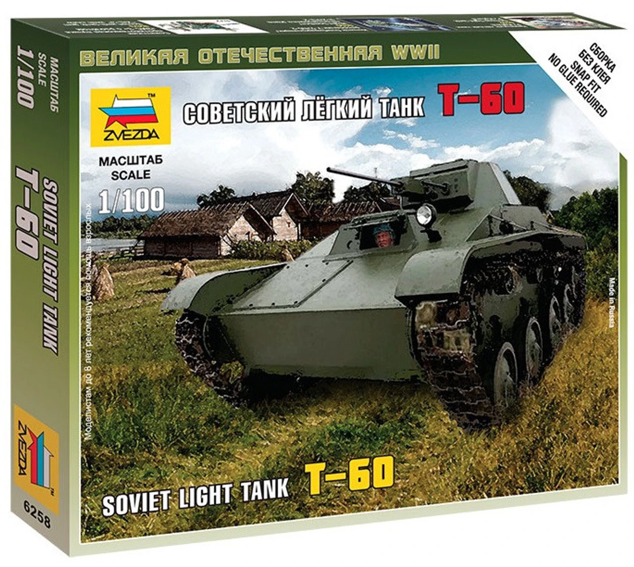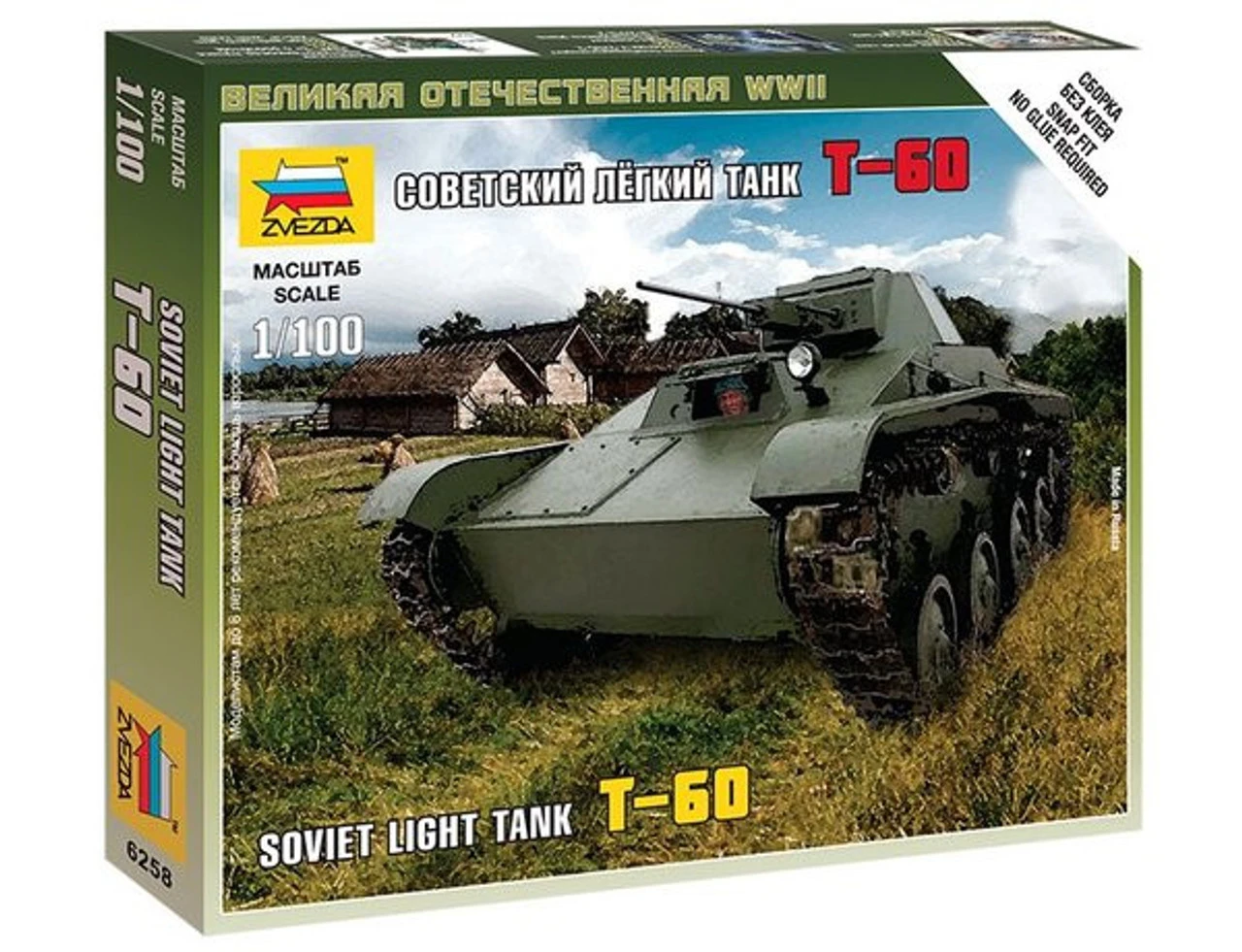 The Zvezda 1/100 Soviet T-60 Light Tank from the plastic tank model kit range accurately recreates the real life Russian light tank from World War II. This model may require paint and glue to complete.
